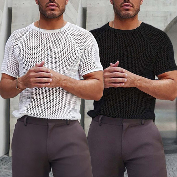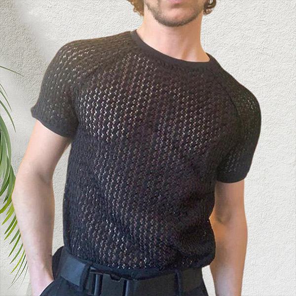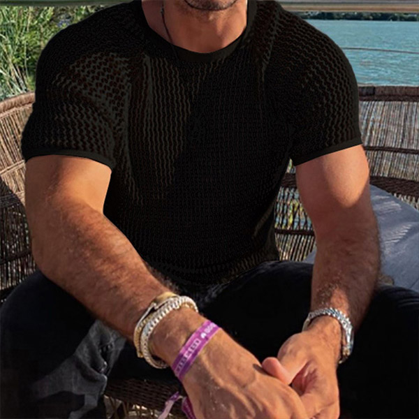 Fashion Solid Color Round Neck Short Sleeve Knitted Hollow Out Shirt for Men