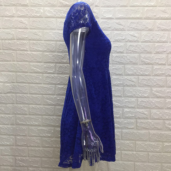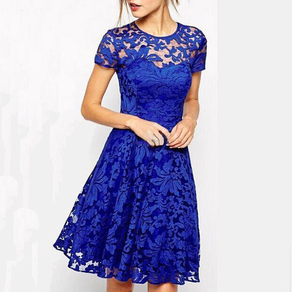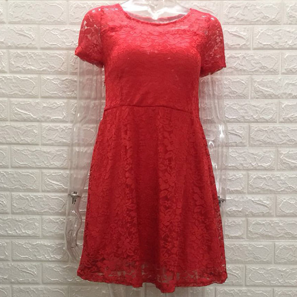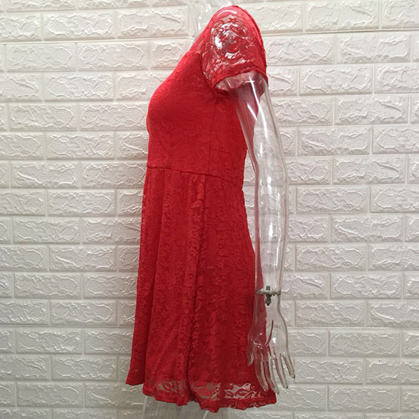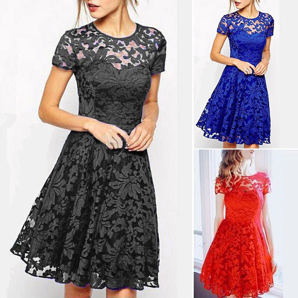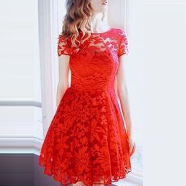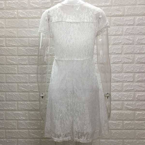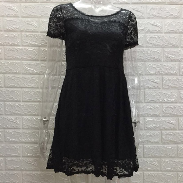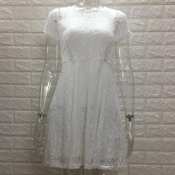 How about this lace dress? The solid color is perfect for any season, and the round neck and short sleeves make it both comfortable and stylish. The lace overlay adds a touch of sophistication, and the A-line silhouette is flattering for any figure. Hope you like it.