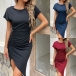 Fashion Solid Color Round Neck Short Sleeve Ruched Irregular Hemline Bodycon Dress