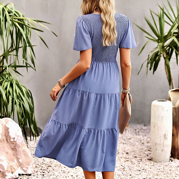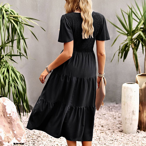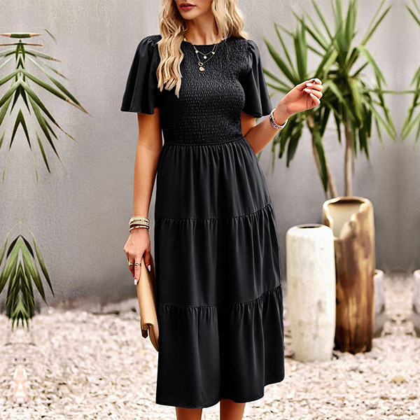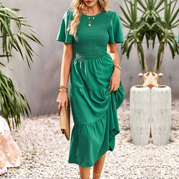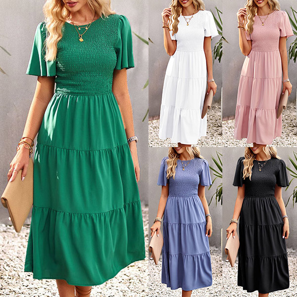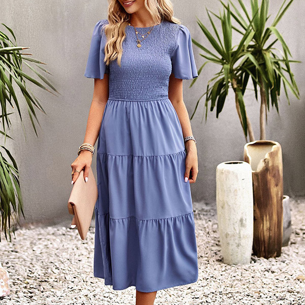 Fashion Solid Color Round Neck Short Sleeve Smocked Tiered Dress