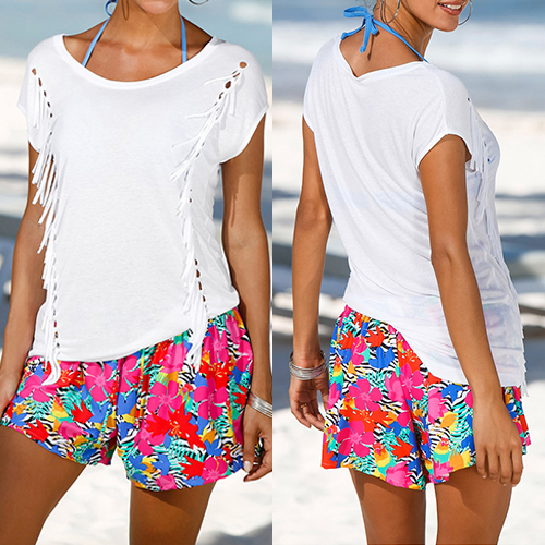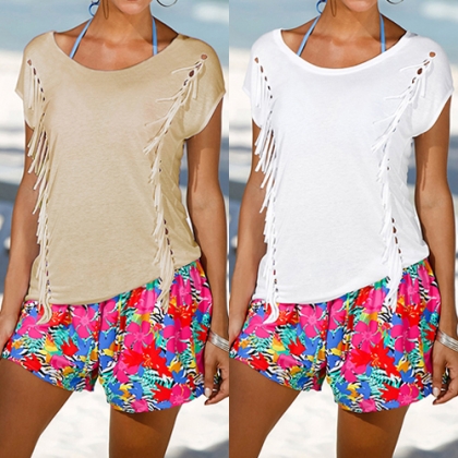 This T-shirt features round neck, short sleeve and tassel design, solid color style, casual and fashion.
