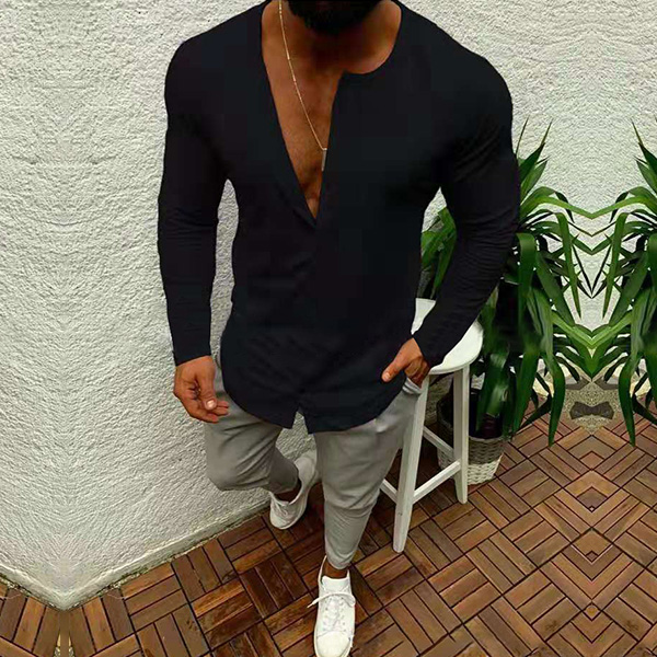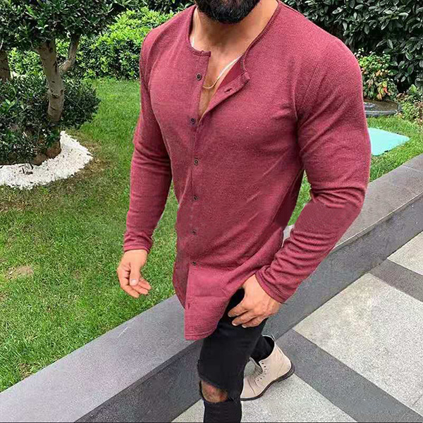 Fashion Solid Color Round-neck Single-breasted Long Sleeve Men’s Shirt