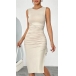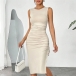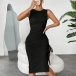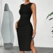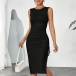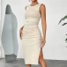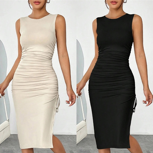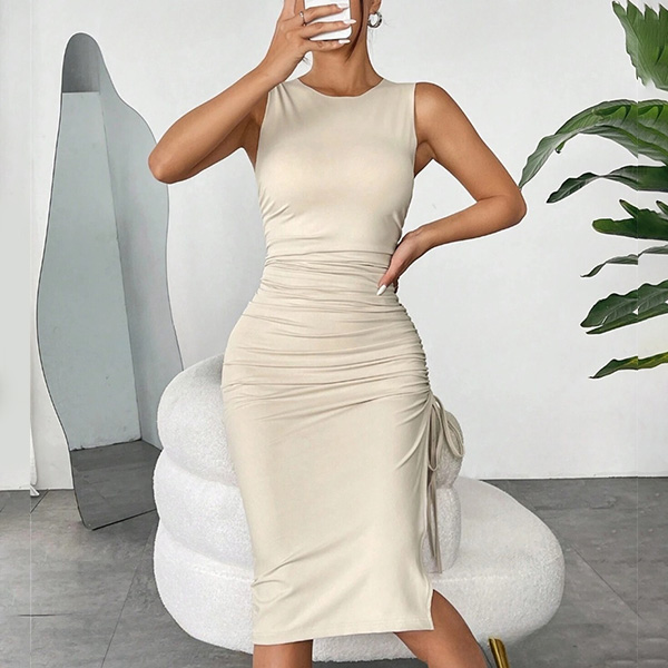 Fashion Solid Color Round Neck Sleeve Side Drawstring Slit Bodycon Dress