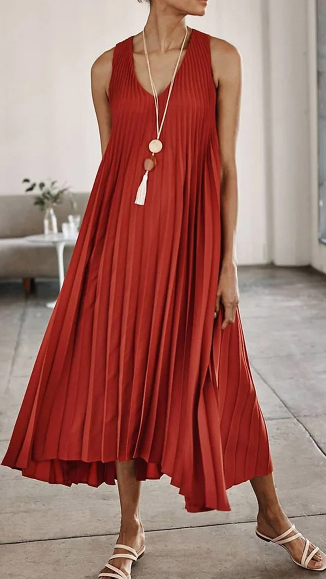 This pleated dress features a classic round neckline and sleeveless design, making it perfect for warmer weather. Wanna have one?