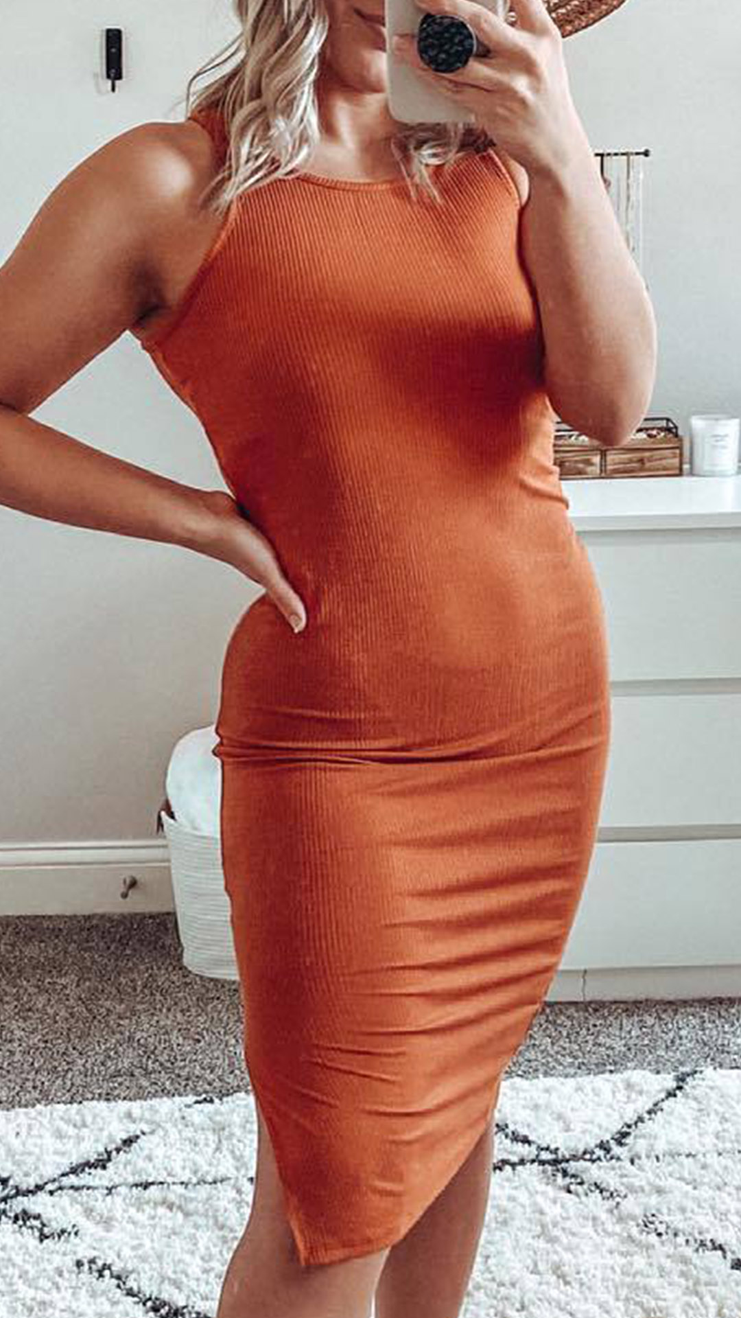 Fashion Solid Color Round Neck Sleeveless Slit Bodycon Tank Dress