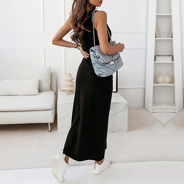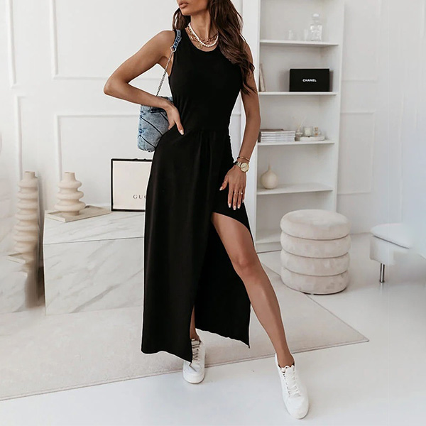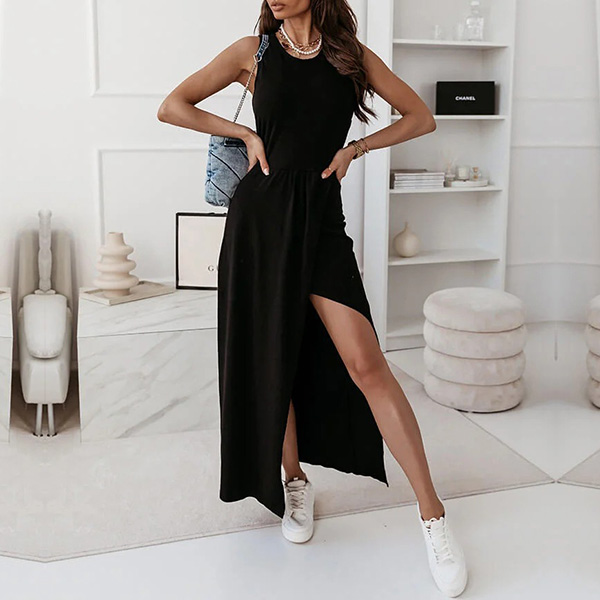 Crafted with lightweight and breathable material, this dress is perfect for any season. The round neck and sleeveless silhouette provide a classic look, while the slit detail adds a modern edge. With its solid color design, it can be easily dressed up or down for any occasion.