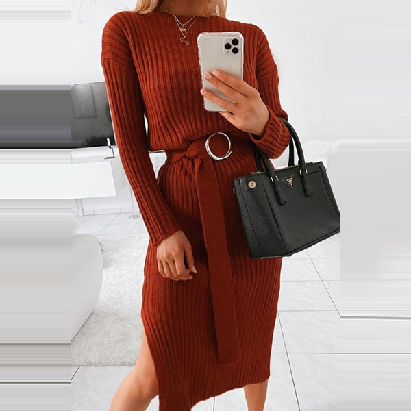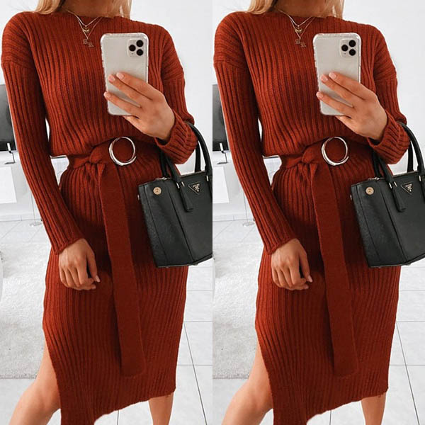Fashion Solid Color Round Neck Slit Hem Slim Fit Knit Dress with A Belt