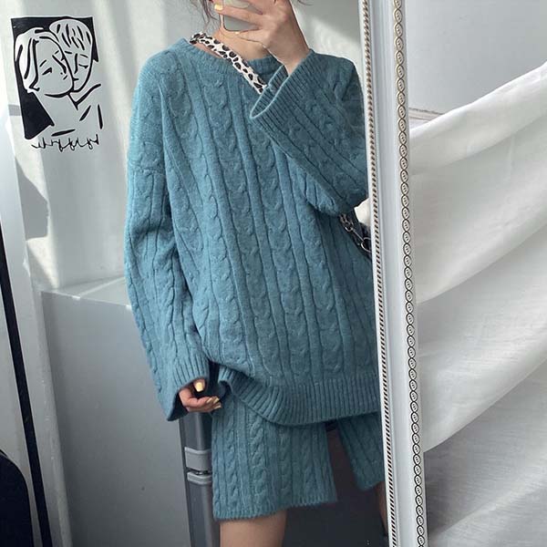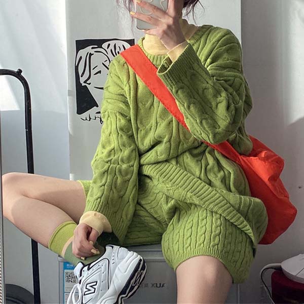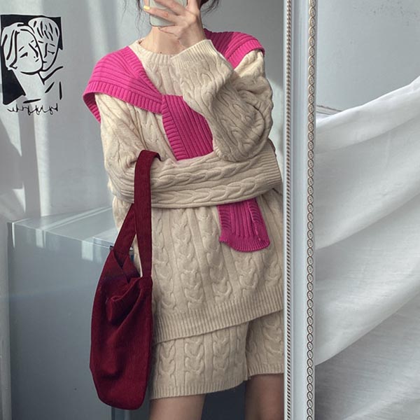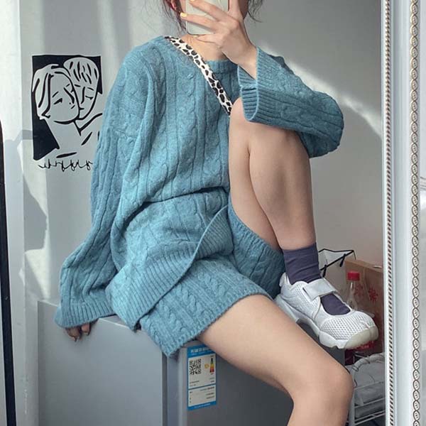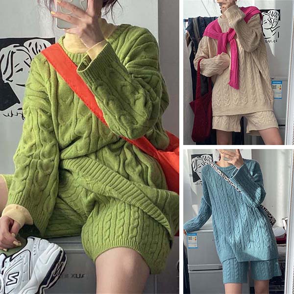 Fashion Solid Color Round Neck Sweater + Shorts Two-piece Set
