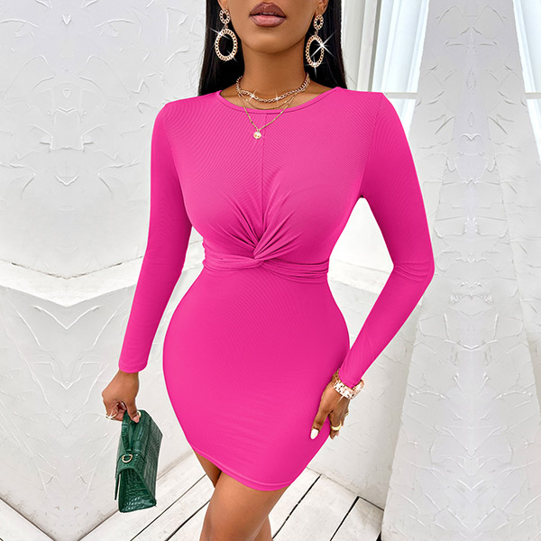 Featuring a round neckline and long sleeves, this dress exudes a chic and elegant vibe. The front ruched detailing adds a fashionable and figure-enhancing accent to this bodycon dress.It is perfect for creating a polished and confident look.