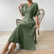 Fashion Solid Color Ruched V-neck Batwing Short Sleeve High-rise Cotton and Linen Midi Dress