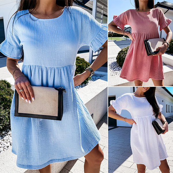 Fashion Solid Color Ruffle Cuff Short Sleeve Round Neck Loose Dress