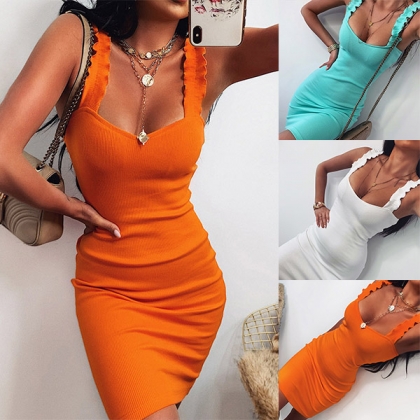 Fashion Solid Color Ruffle Knitted Bodycon Dress