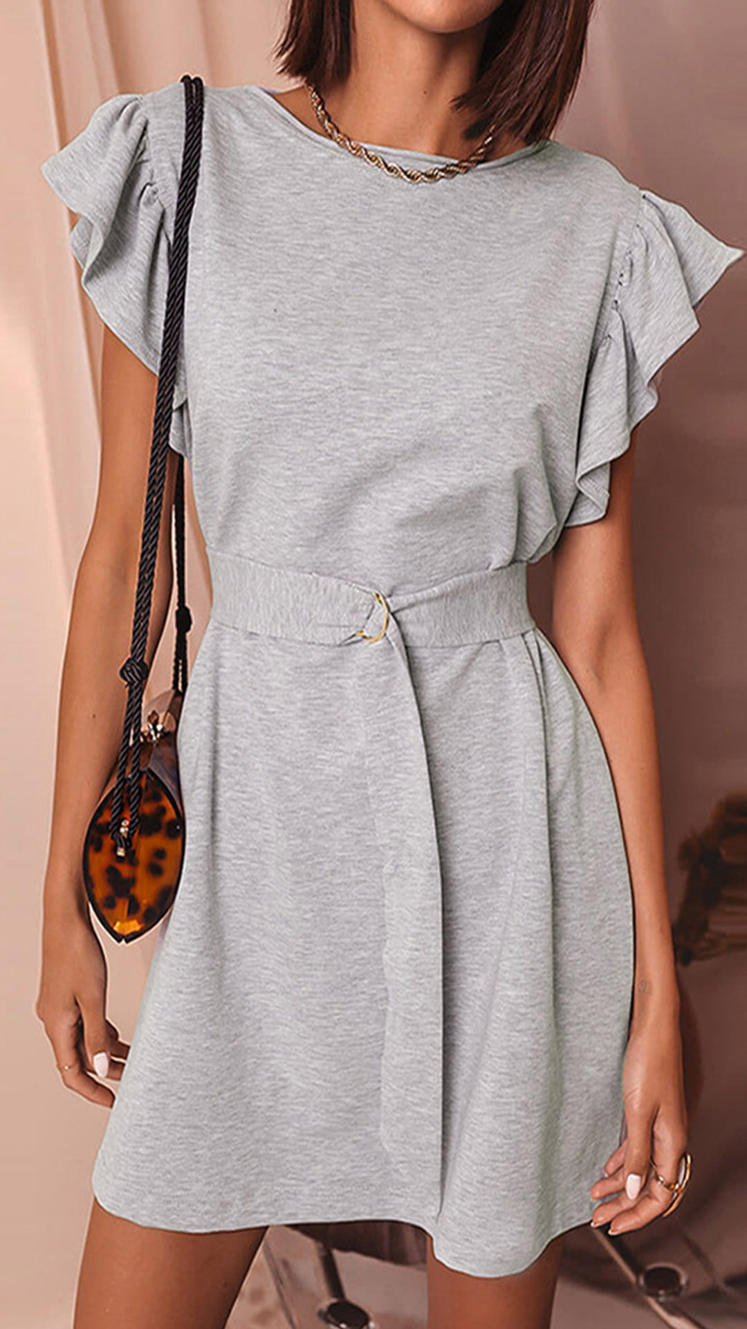 This mini dress is perfect for a summer day! The solid color is perfect for any skin tone, and the ruffle detail along the short sleeve adds a touch of femininity. The belt cinches in the waist for a flattering fit, and the dress is made from a lightweight fabric that is perfect for hot summer days!