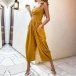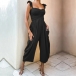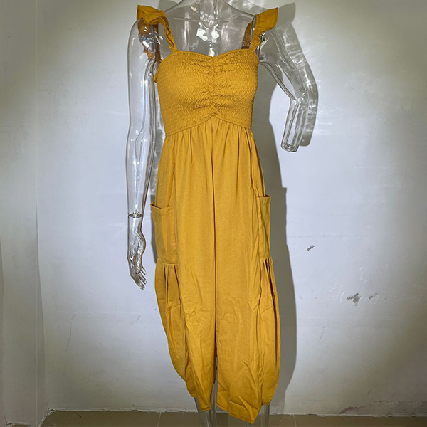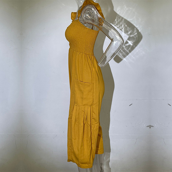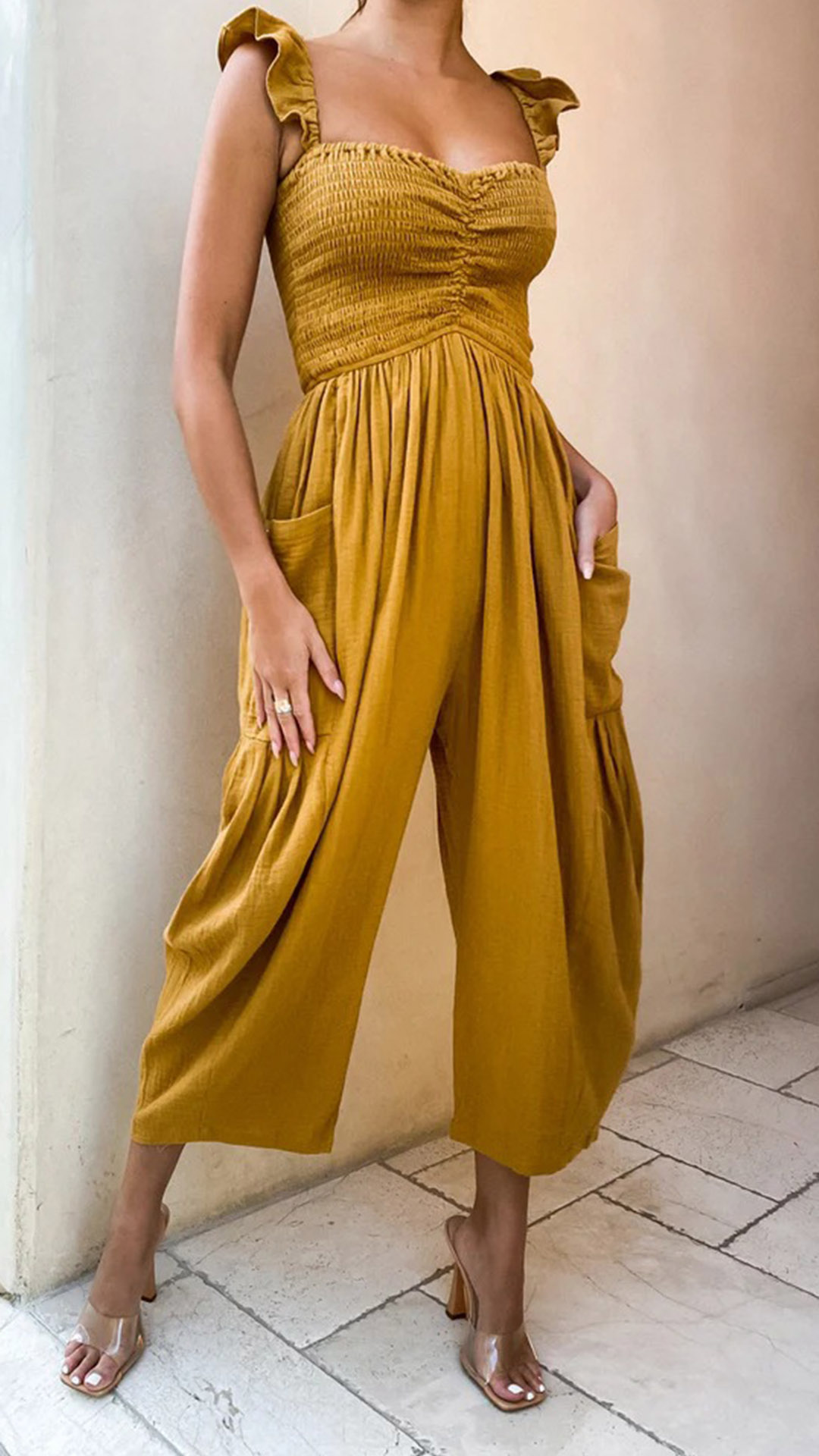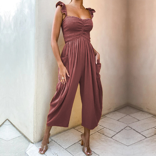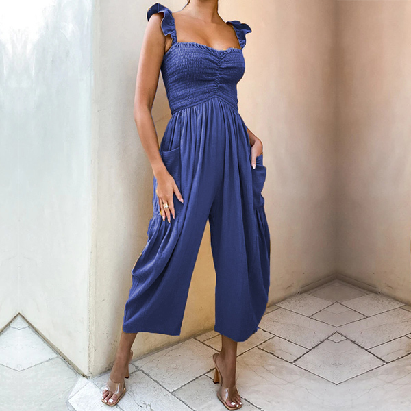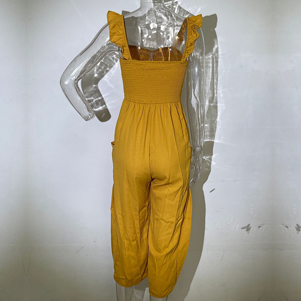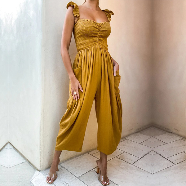 Fashion Solid Color Ruffle Square Neck Smocked Side Patch Pockets Loose Jumpsuit