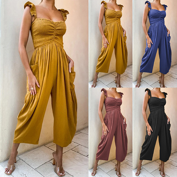 This Fashion Jumpsuit is a must-have for any fashion-forward woman. The jumpsuit features a square neckline with ruffle shoulder detailing that adds a touch of elegance to the design. The smocked bodice provides a comfortable fit while cinching in at your natural waist to create a flattering silhouette. The side patch pockets add a practical touch to the garment, making it perfect for everyday wear. The loose fit of the jumpsuit allows for ease of movement, making it ideal for any occasion. It is so cool! Wanna have one?