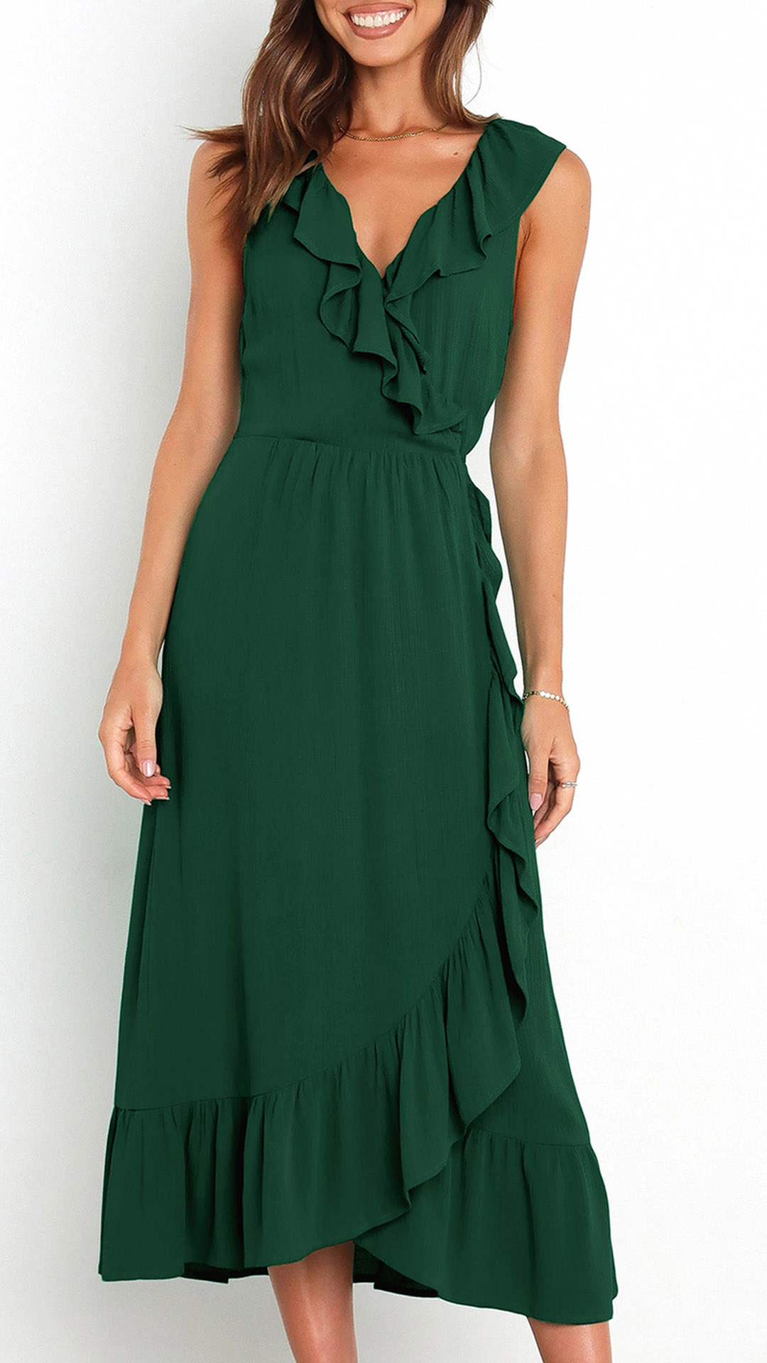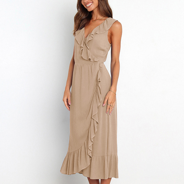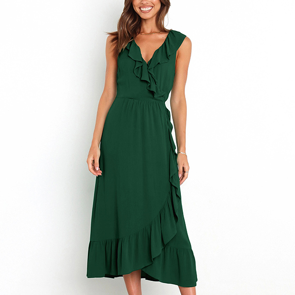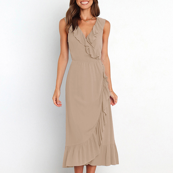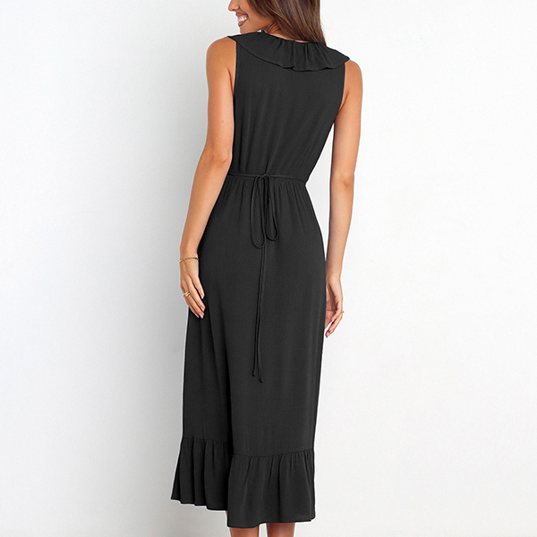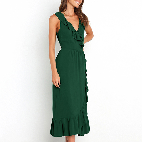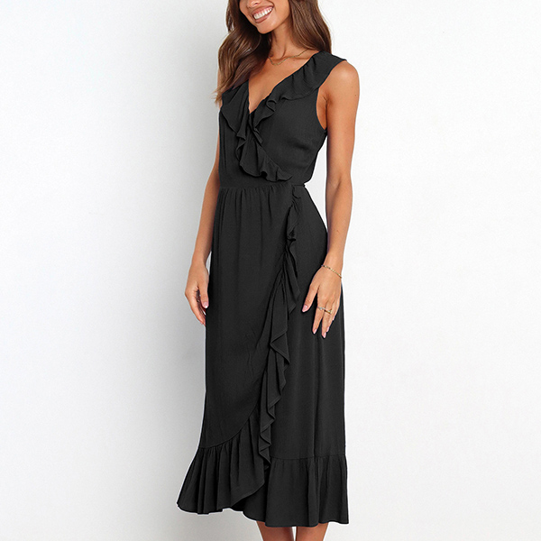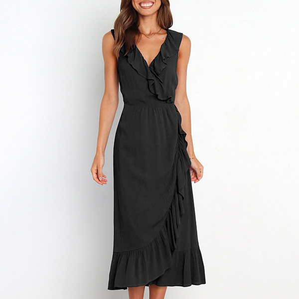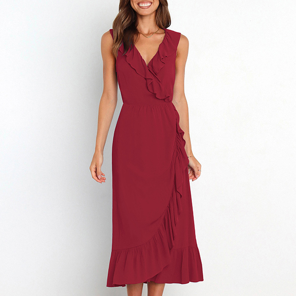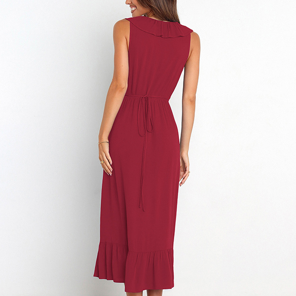 This is a fashionable midi dress with a solid color design, a V-neckline, and sleeveless design. It features a beautiful ruffle detail along the V-neck and skirt that adds a touch of elegance and femininity. The slit detail creates a playful and flirty feel to the dress, and it is perfect for any occasion where you want to look both stylish and confident.