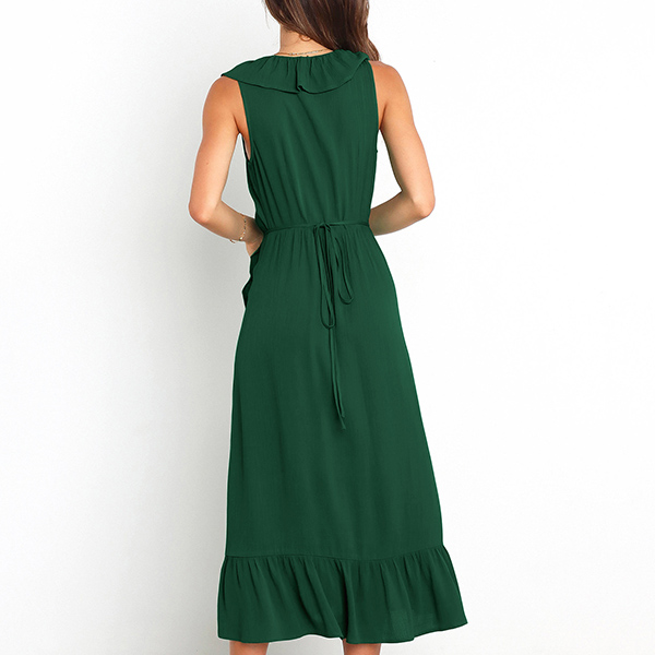 Fashion Solid Color Ruffle V-neck Sleeveless Slit Midi Dress