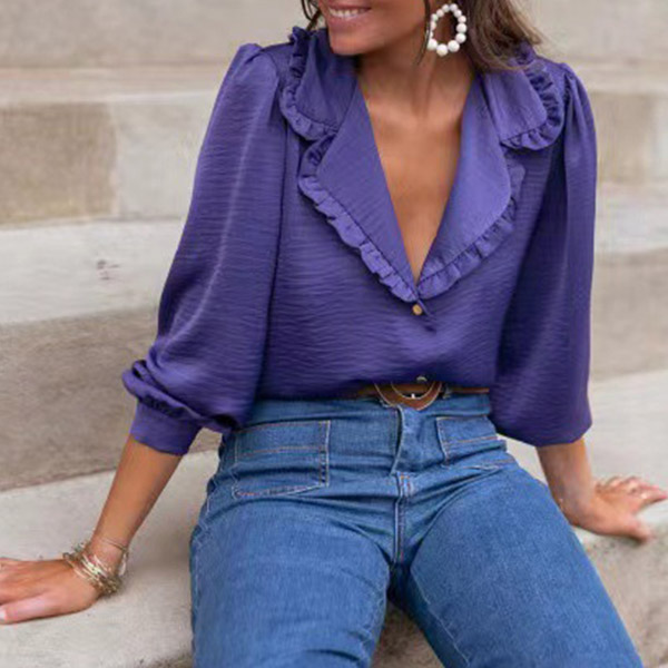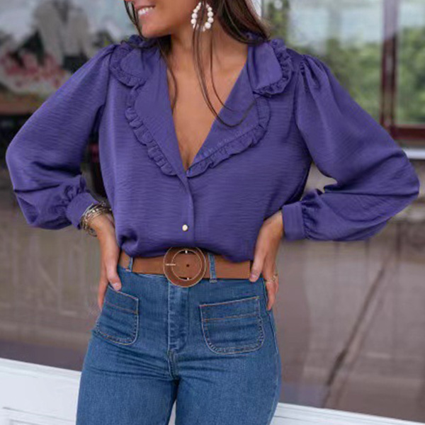 This fashionable and stylish shirt is perfect for any occasion! The solid color and ruffled lapel make it stand out, while the V-neck and long sleeves make it both comfortable and flattering.