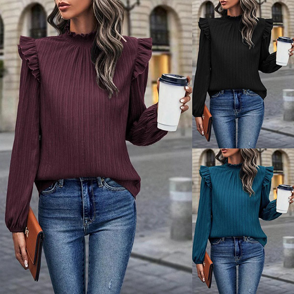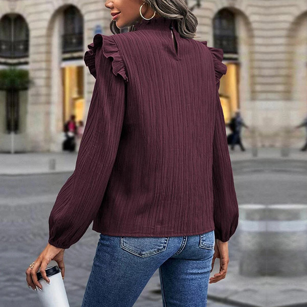Fashion Solid Color Ruffled Mock Neck Long Sleeve Shirt