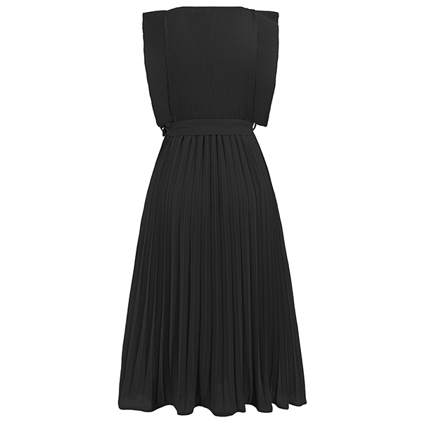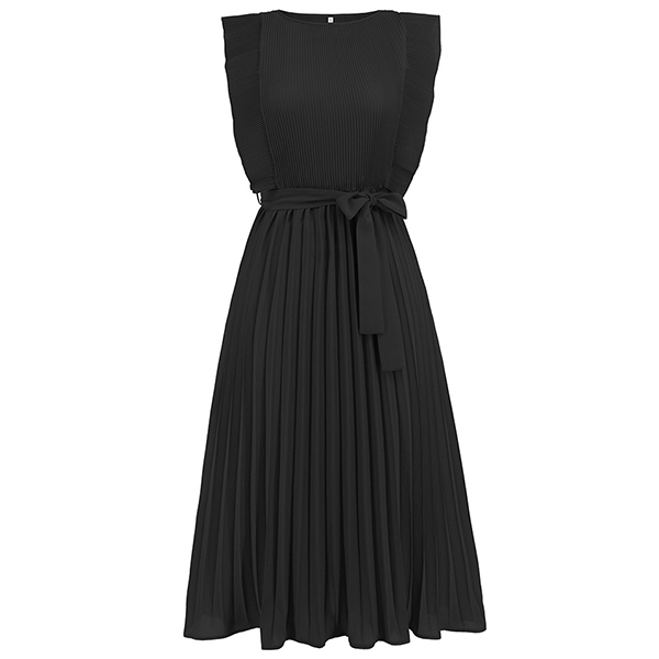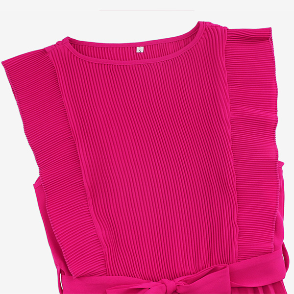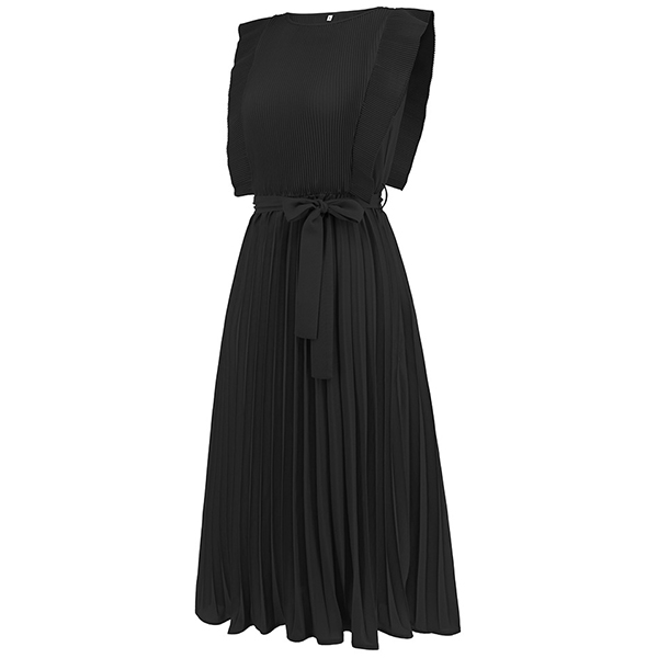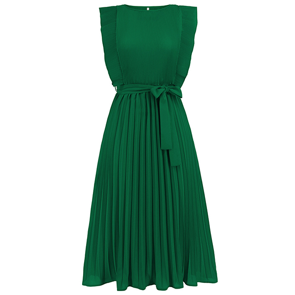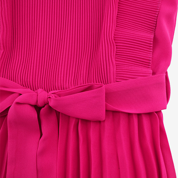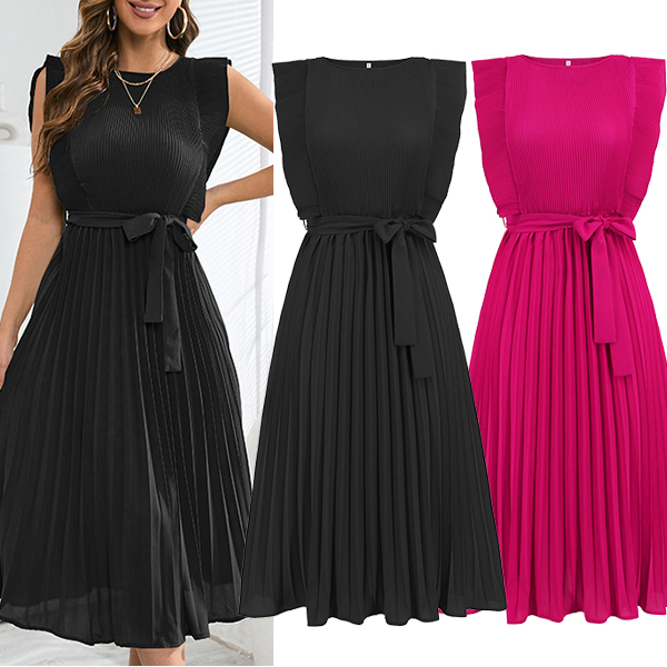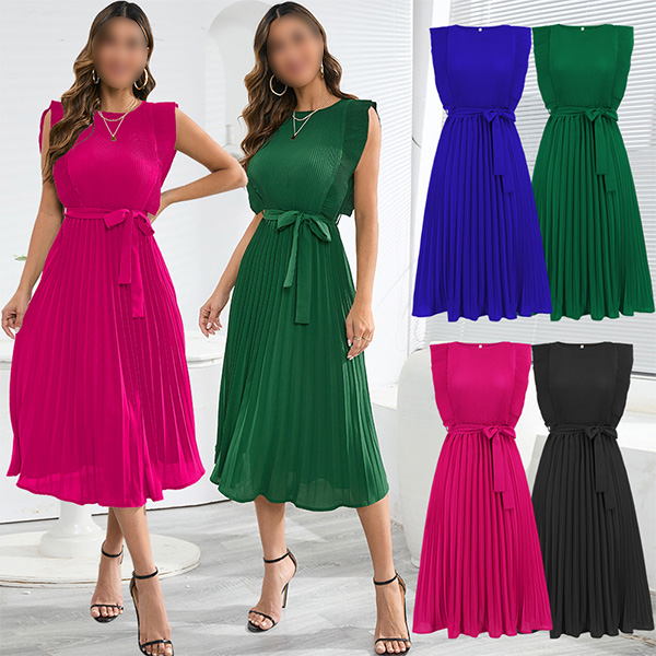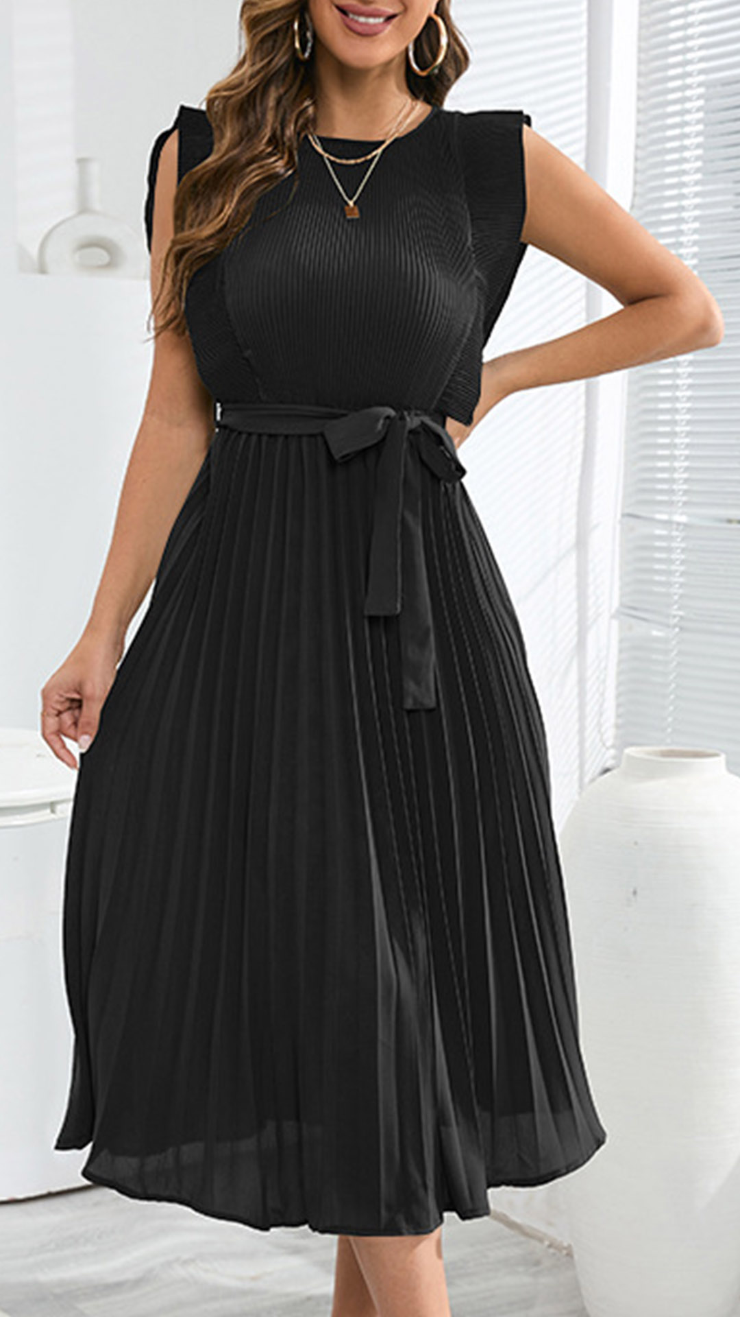 This dress features a front ruffled details that adds a touch of elegance and sophistication to the overall style. The self-tie waistline creates a flattering and figure-hugging fit, while the pleated detailing adds a modern and trendy twist to the dress.It is a perfect addition to your wardrobe for a chic and stylish look.
