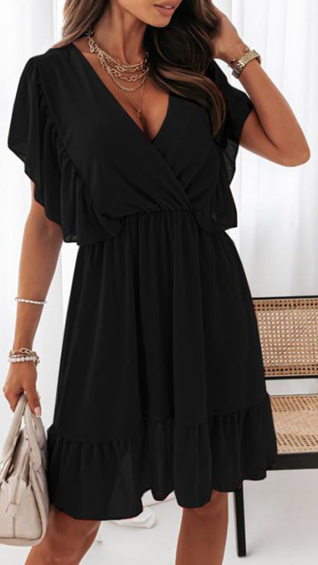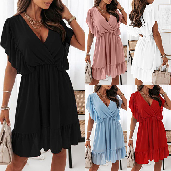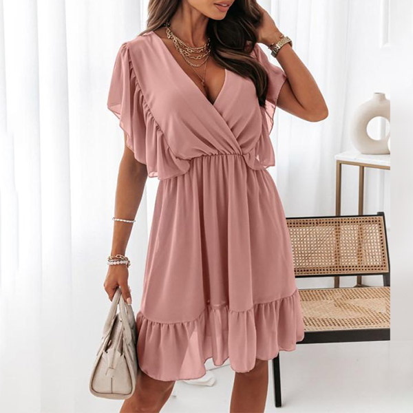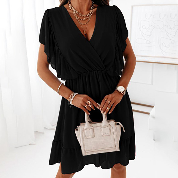 Fashion Solid Color Ruffled V-neck Dress