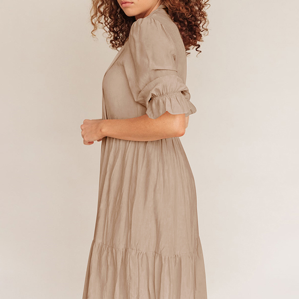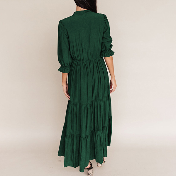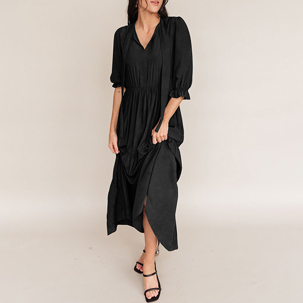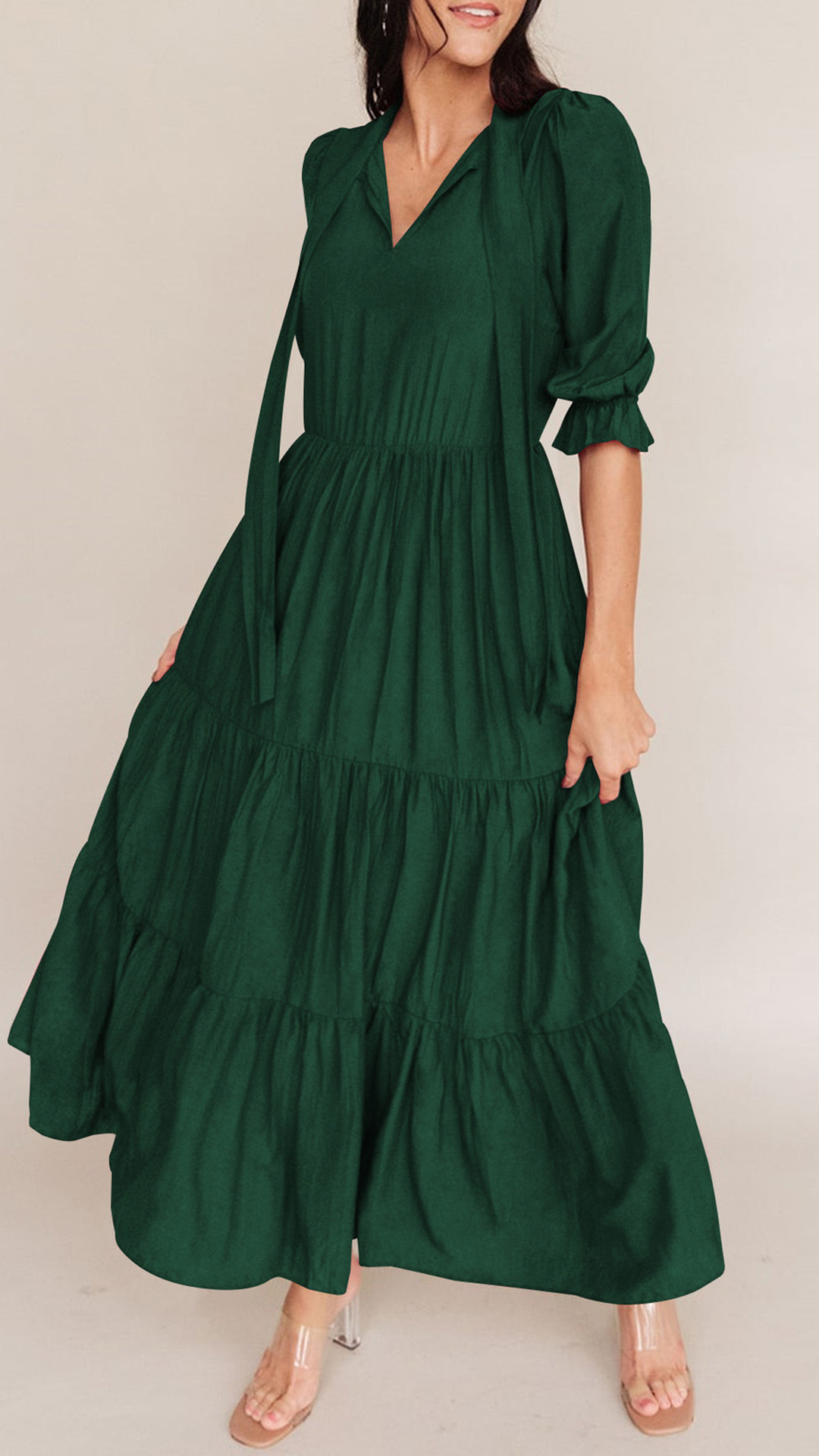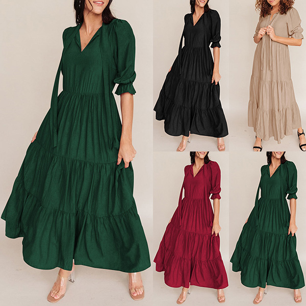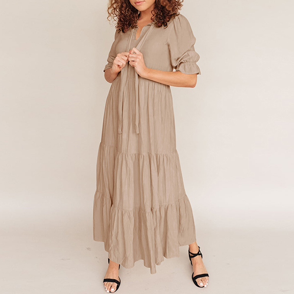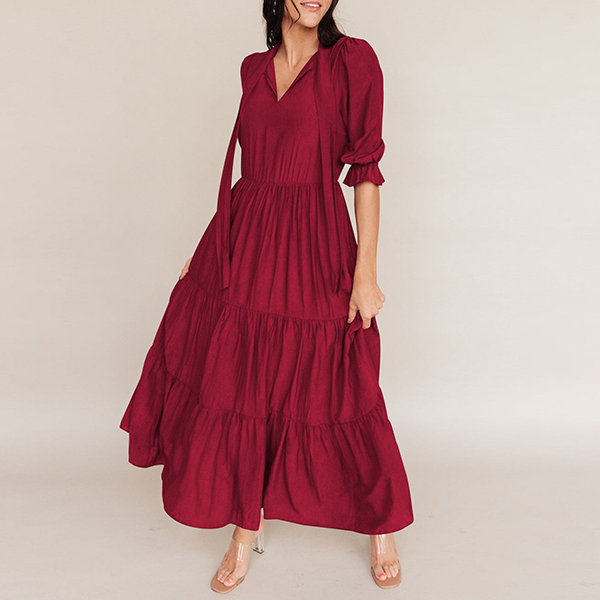 Fashion Solid Color Self-tie V-neck Elbow Sleeve Ruched Tiered Dress