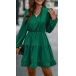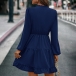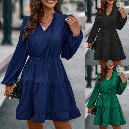 Fashion Solid Color Self-tie V-neck Long Sleeve Tiered Dress