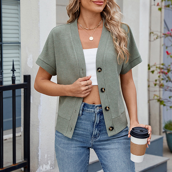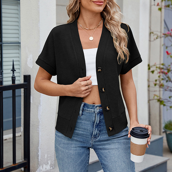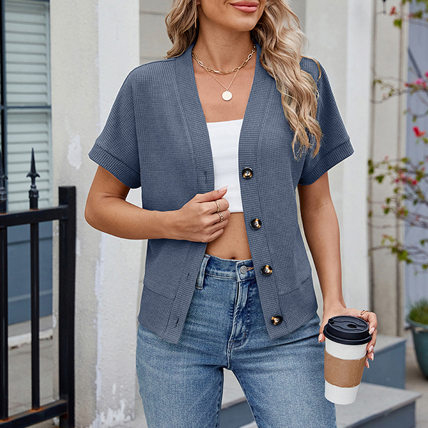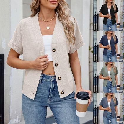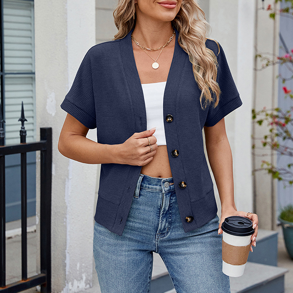 Stay cozy and chic with this fashion knitted cardigan. The lightweight knit fabric makes it perfect for layering over your favorite tops and dresses. With its classic front button design and short sleeves, this cardigan adds a touch of elegance to any outfit. Ideal for transitional weather, it pairs beautifully with jeans, skirts, or even shorts.