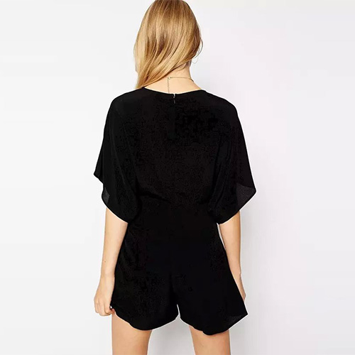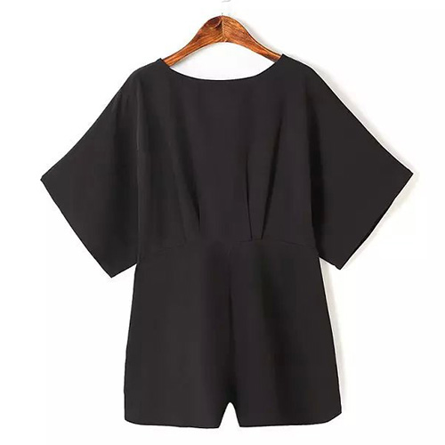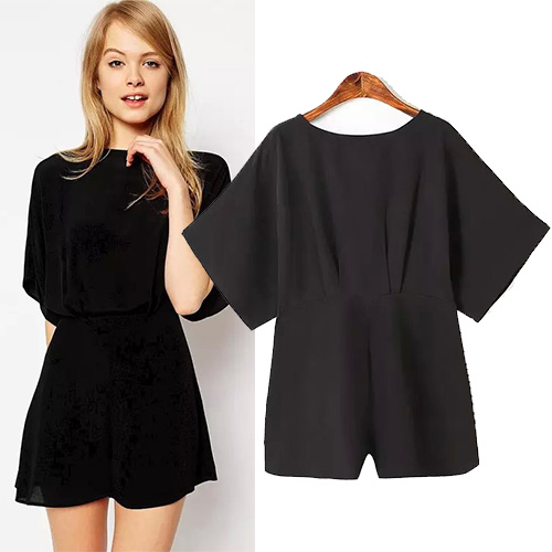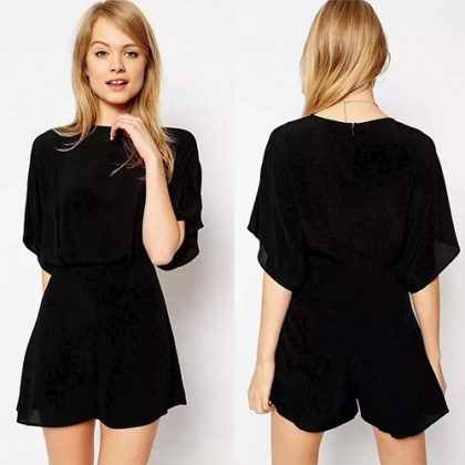 This jumpsuit features solid color,with short sleeve,round neck and high waist design,