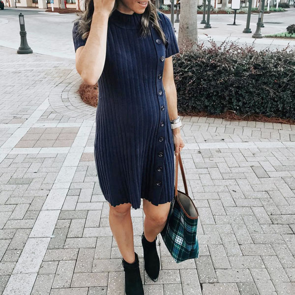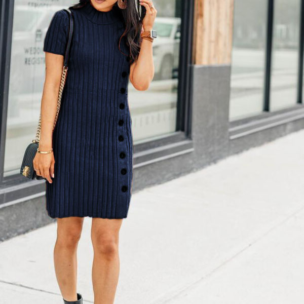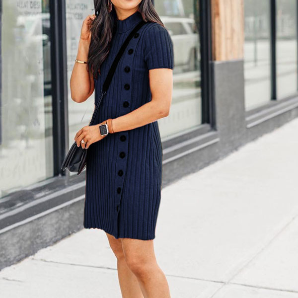Cozy yet keeping it feminine, introduce this wonderful piece into your smart ensemble. Solid color tone design makes it look generous yet elegant,while the side-button details will make this piece full of style and charm. Finished with short sleeve,mock neck and a fit silhouette,this knit dress knows how to make you look fashionable and charming.