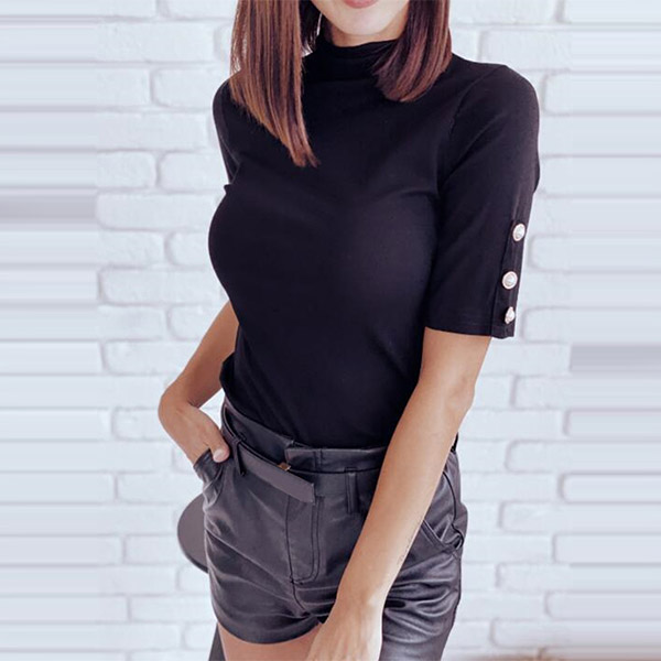 This t-shirt comes with a solid color,its short sleeve and mock neck design,which can ensure you a comfortable day with its soft and breathable fabric. And the beaded details at the sleeve part will further enhance its charm. You can simply match with your favourite pants to have a fashionable daily look.