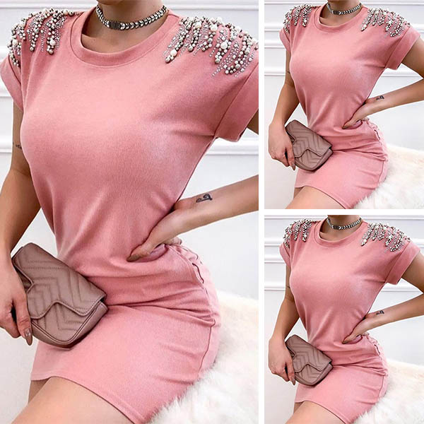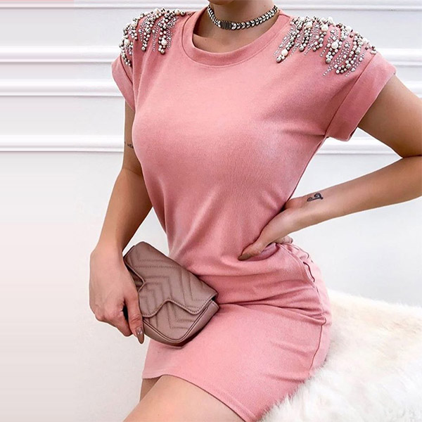 For some rushed mornings and busy workdays,you must have no time to think about what to wear. SO we suggest you this cozy yet stylish t-shirt dress. Comes with a sweet pink tone,the beaded details will make this piece look more attractive. Simply need to match with your favourite shoes,then you can be ready to go out!