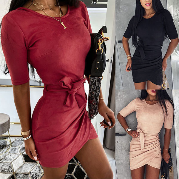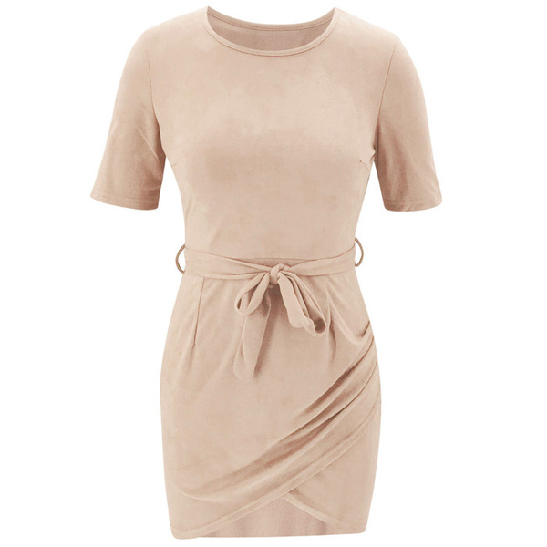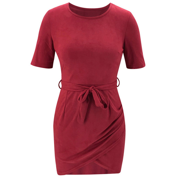 Fashion Solid Color Short Sleeve Round Neck Dress with Waist Strap