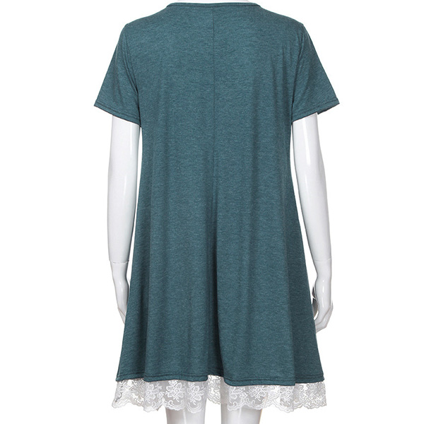 Fashion Solid Color Short Sleeve Round Neck Lace Spliced hem Loose Dress