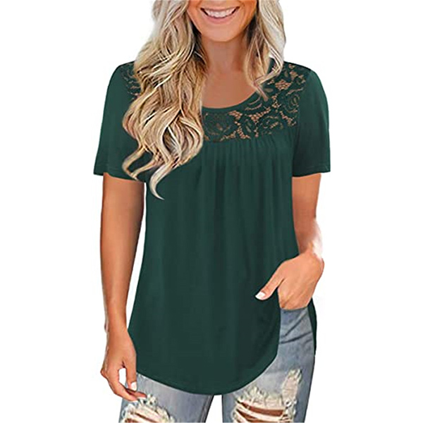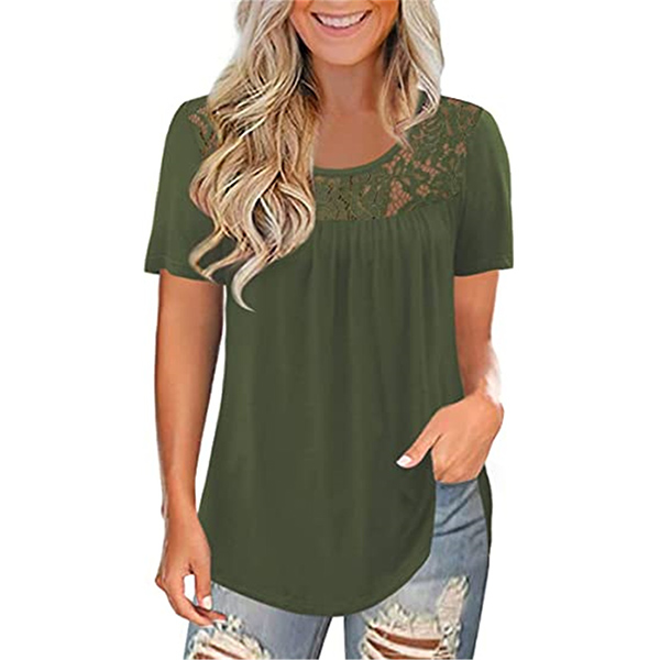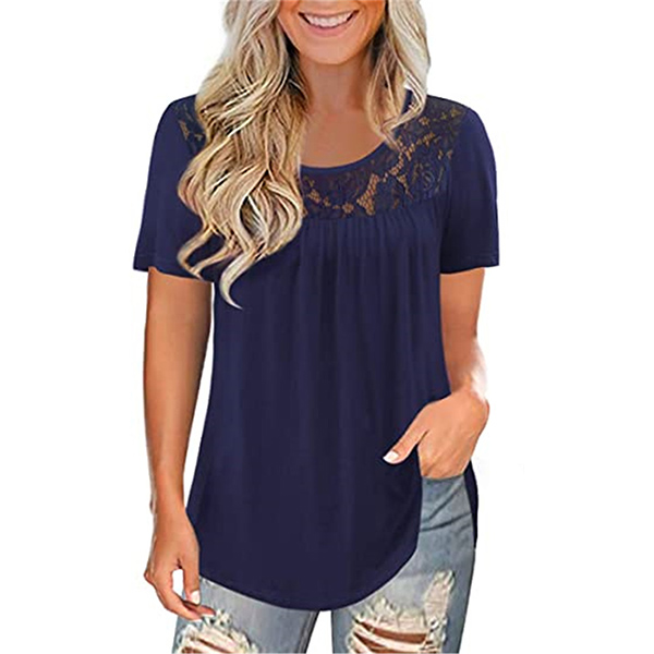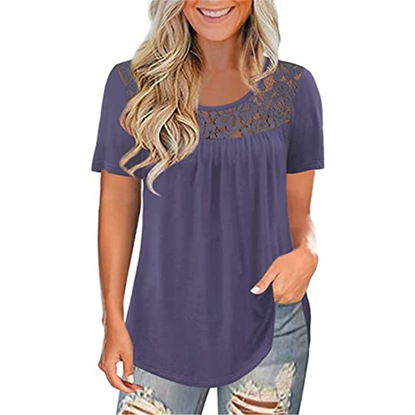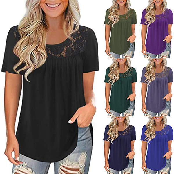 This short sleeve t-shirt is the perfect addition to your summer weather wardrobe ensemble. Comes with a solid color,the lace spliced details will enrich the design style. Finished with short sleeve and round neck design,this t-shirt can ensure you a comfortable day. Different colors for your optional.