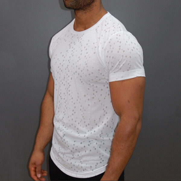 with short sleeve and round neck design,simple yet stylish. And the ripped details make this piece look more