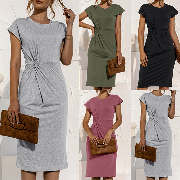 Fashion Solid Color Short Sleeve Round Neck Slim Fit Twisted Dress