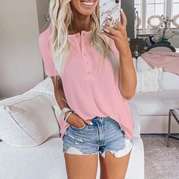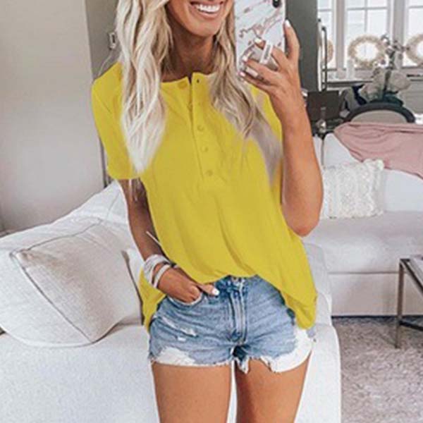 For these summer days,this short sleeve t-shirt is yearning for a place in your wardrobe. Solid color tone design makes it look simple,stylish yet generous,while the button details at the neckline part will add some charm. All-match design allows to be matched with different style bottoms.