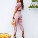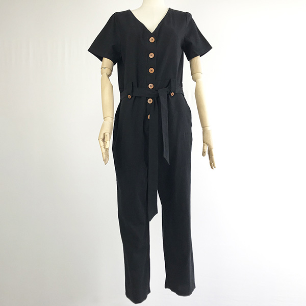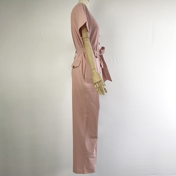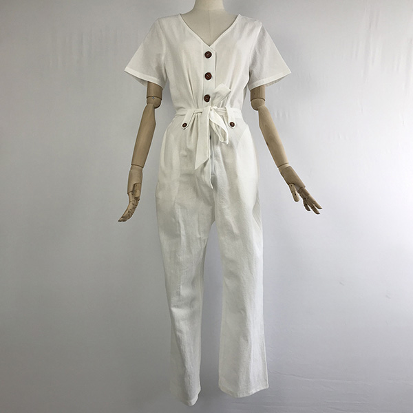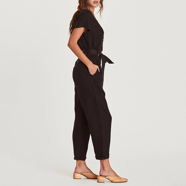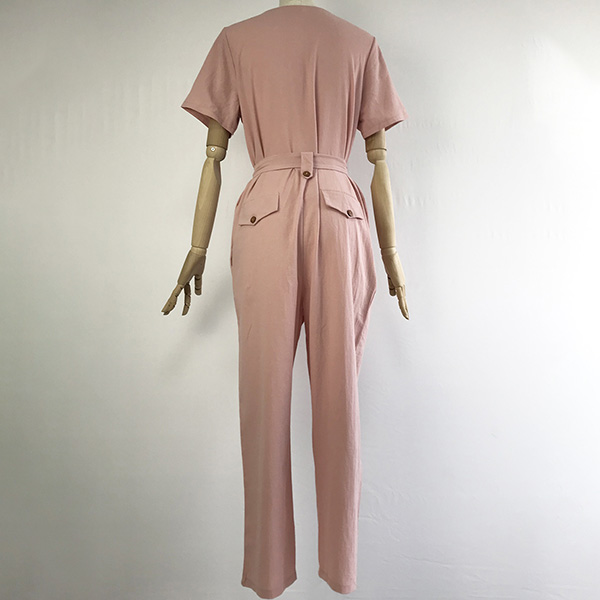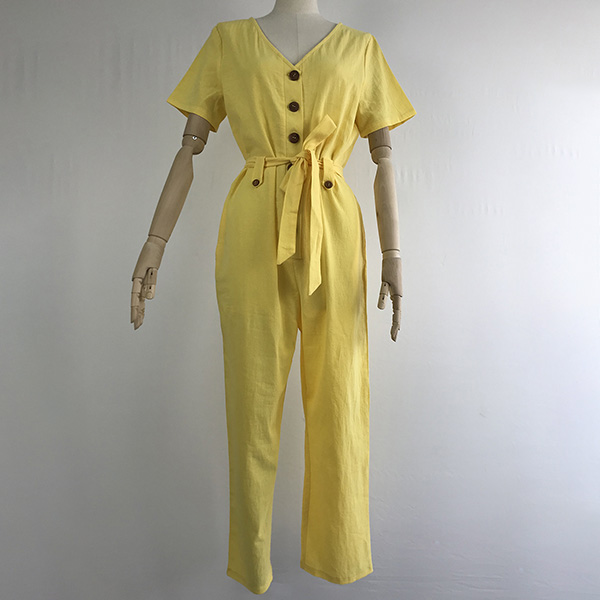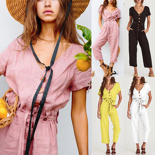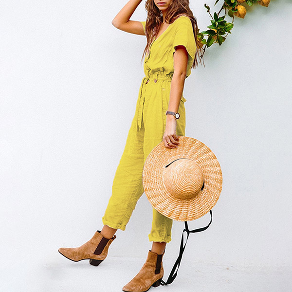 As for an instant fashion style,you can just slip into this jumpsuit. Solid color style,finished with short sleeve,v-neck and front-button details,this wonderful piece can ensure the comfy while it exudes your style and charm. So why not seize this chance to upgrade your style?