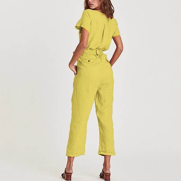 Fashion Solid Color Short Sleeve V-neck Front-button Jumpsuit