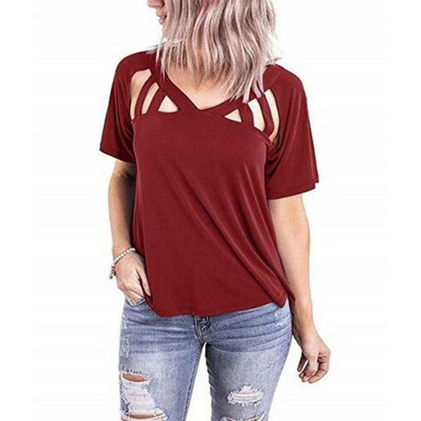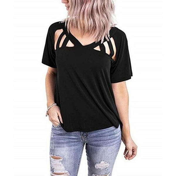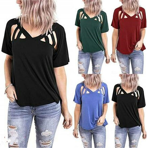 Crafted from soft and breathable fabric,with short sleeve,v-neck and a loose silhouette design,this t-shirt can offer you a comfortable day,while the hollow out design will add some charm. For your casual days,this t-shirt is a good choice.