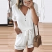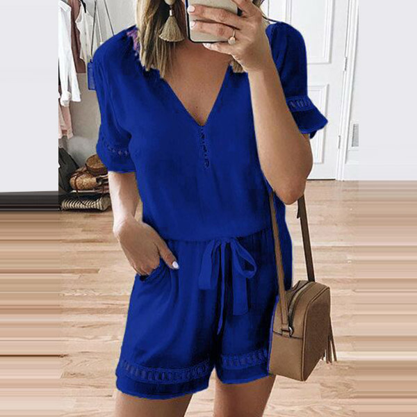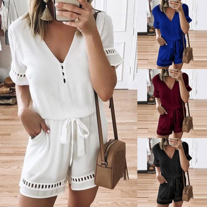 Fashion Solid Color Short Sleeve V-neck Lace-up Drawstring Waist Romper