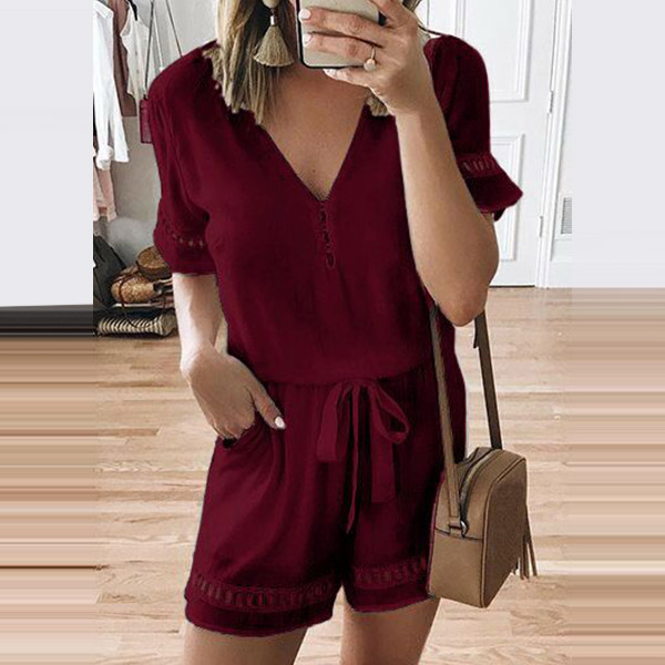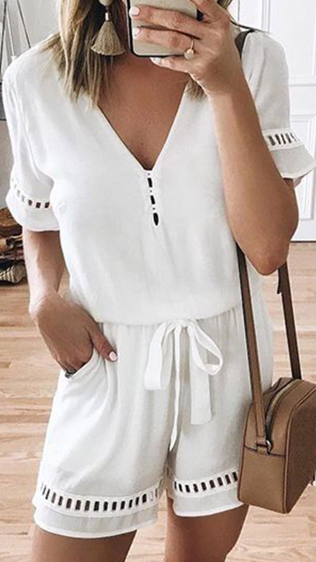 When you are tired of the dresses and t-shirts,then this romper is your another good choice. Boasts a solid color,finished with short sleeve and v-neck design,this piece definitely can give you a cozy yet stylish style. And the lace-up drawstring design at the waist part can better showcase your slender figure. For these summer days,this wonderful piece is worth to arouse your attention.