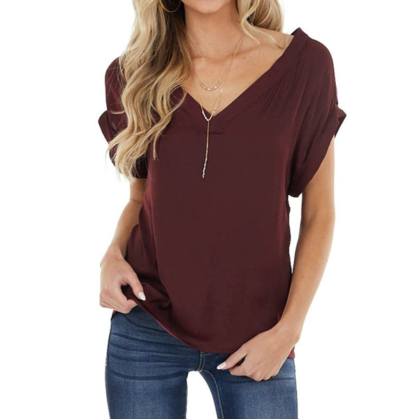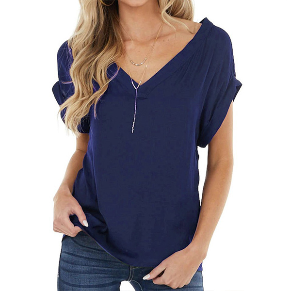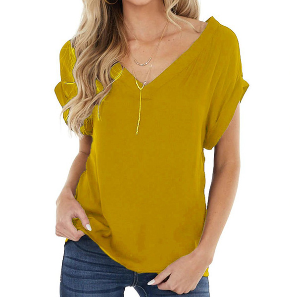 Fashion Solid Color Short Sleeve V-neck Loose T-shirt