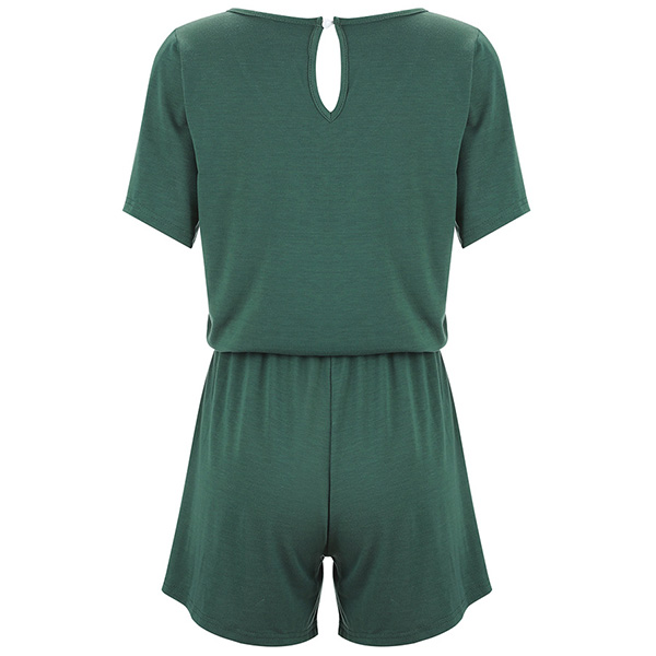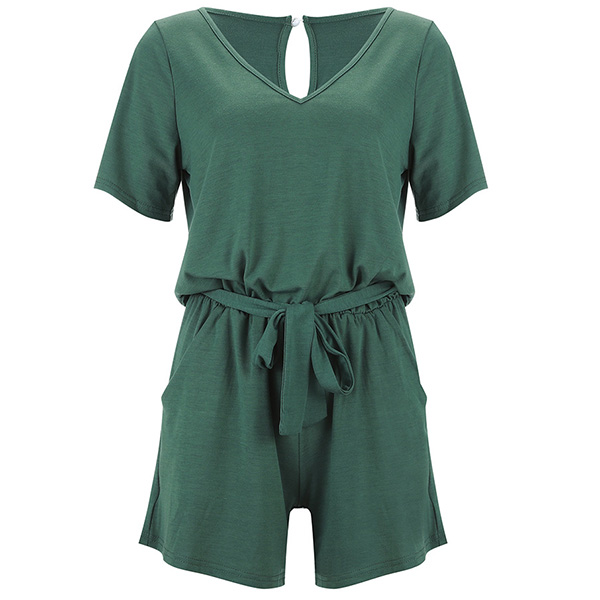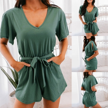 Fashion Solid Color Short Sleeve V-neck Romper with Waist Strap