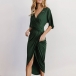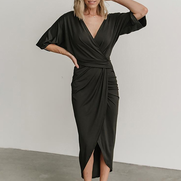 This midi dress features a solid color design, a V-neckline, short sleeves, ruched detailing, and a side slit for a fashionable and flattering look.