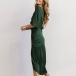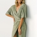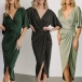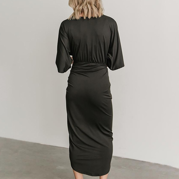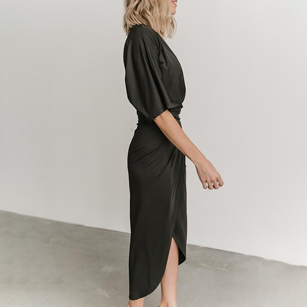 Fashion Solid Color Short Sleeve V-neck Ruched Slit Midi Dress