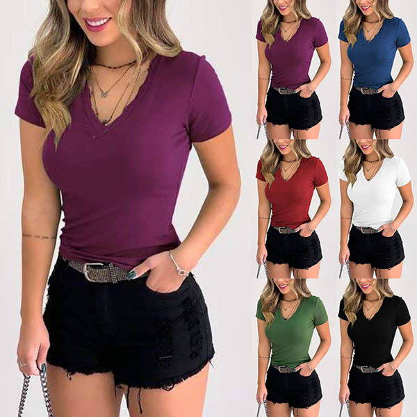 Fashion Solid Color Short Sleeve V-neck Slim Fit T-shirt