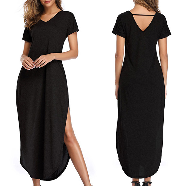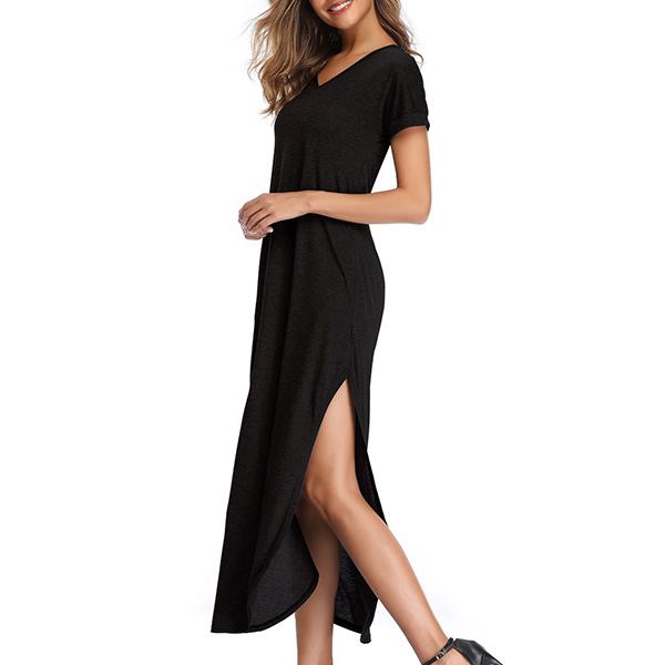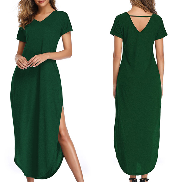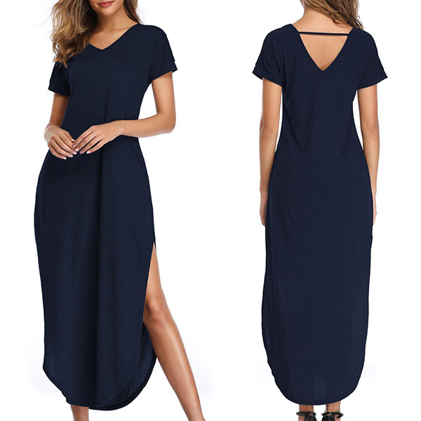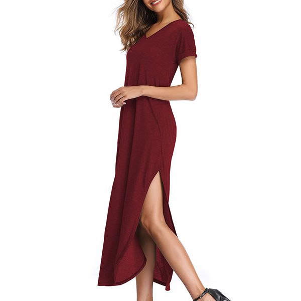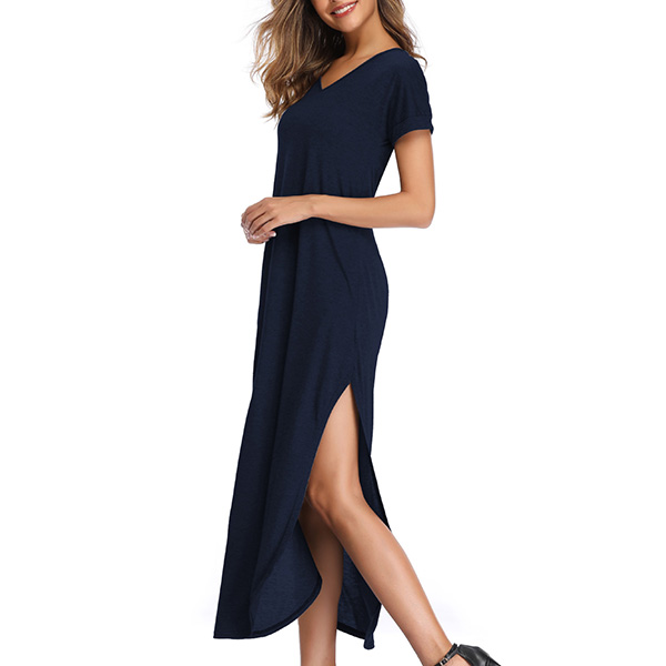 Combines of style and comfort,this dress is what you are seeking for! Solid color tone design makes it look simple get generous,while the v-neck and unique slit hem design will make this piece look more attractive. So why not add it to your summer wardrobe ensemble?