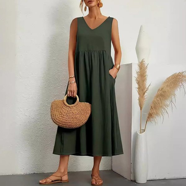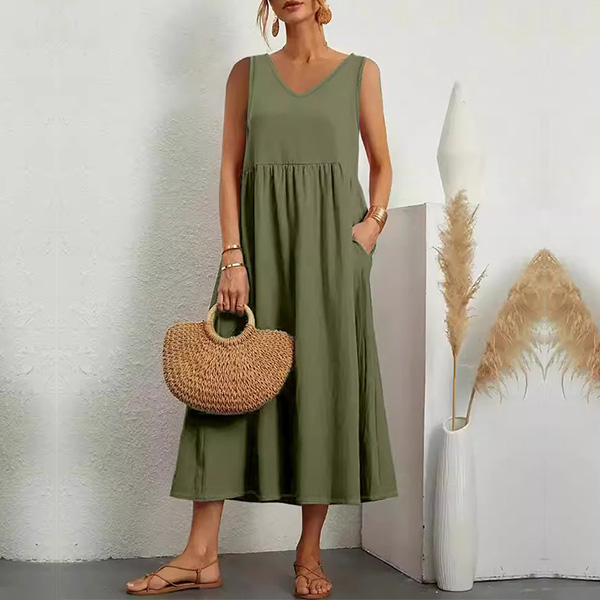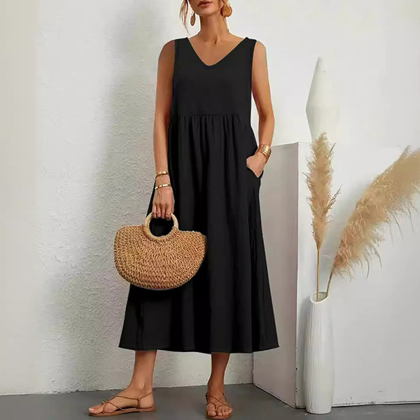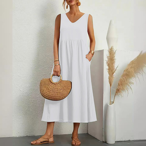 If you like simple style dress,then make your eyes focused on this piece. It comes with a solid color,finished with sleeveless,round neck,high waist and a maxi length,this dress bears a simple design style,but it can showcase your slender figure as well as exude your style. Perfect fit for these summer days.